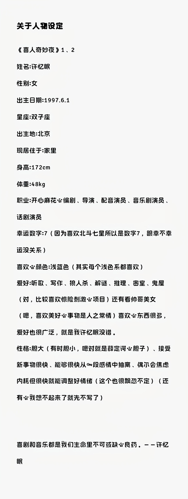 许忆眠“hello大家好,我是许忆眠,是一名话剧演员配音演员音乐剧演员,同时呢也是开心麻花的一名编导。”