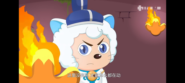 喜羊羊观察着这里,心里疑惑:这里没有风,火苗怎么都在动?难道有人刚刚在走廊上跑动过?